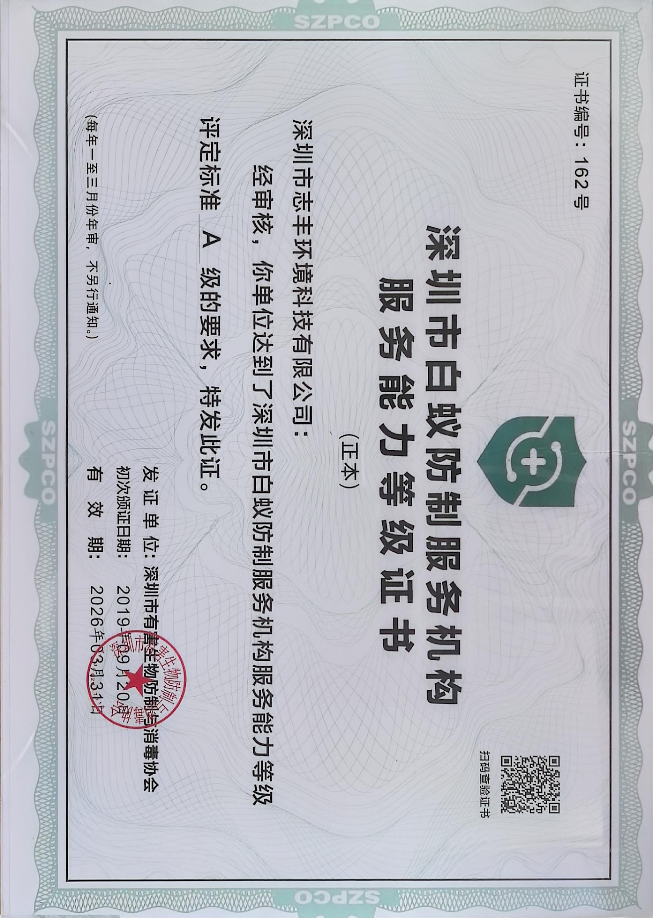 10年專注病媒生物防治,擁有“深圳市病媒生物防治服務機構服務能力A級證書”,驗收標準嚴于國家標準,連續3年深圳市有害生物防治協會授予“先進企業”。